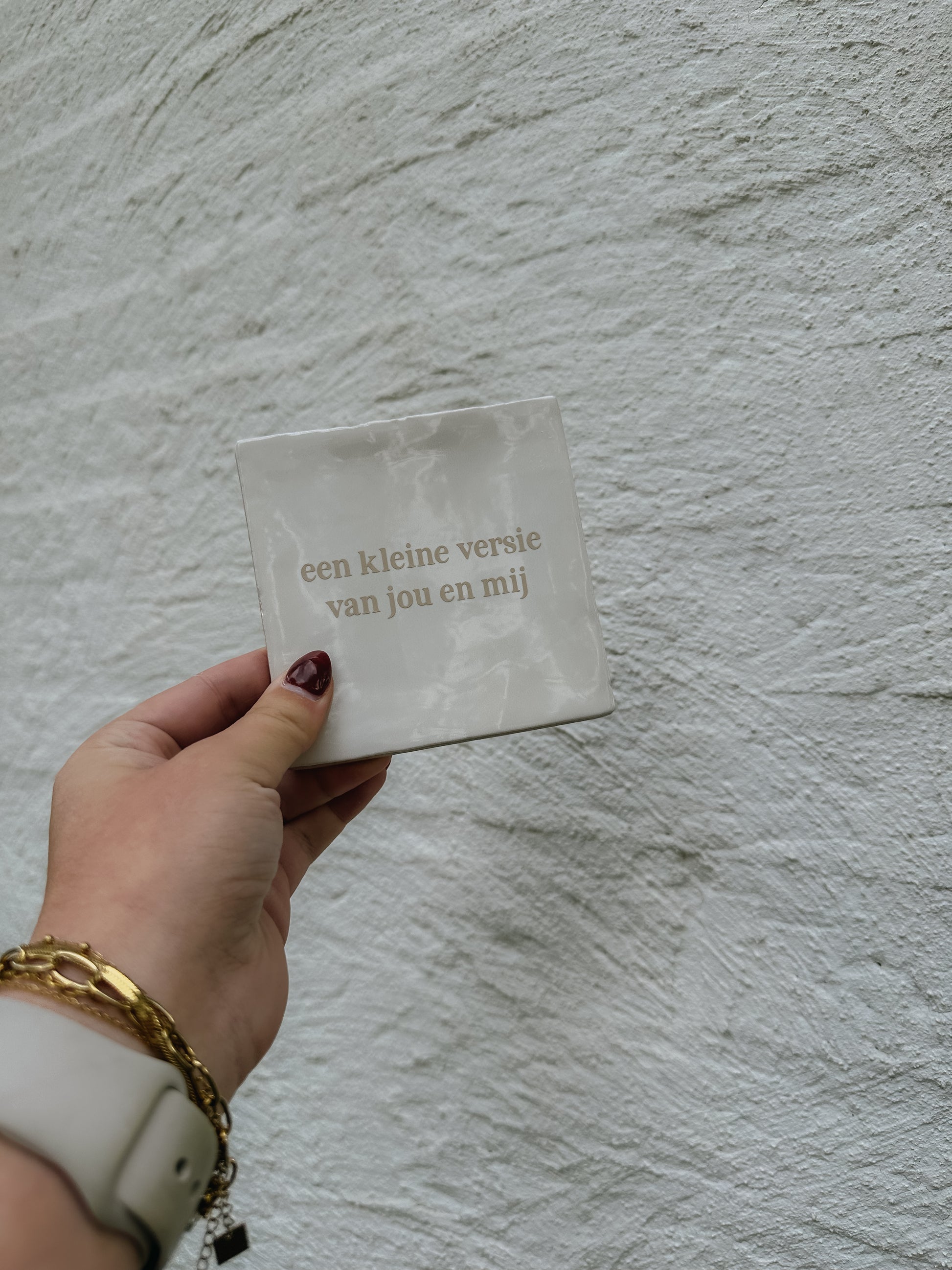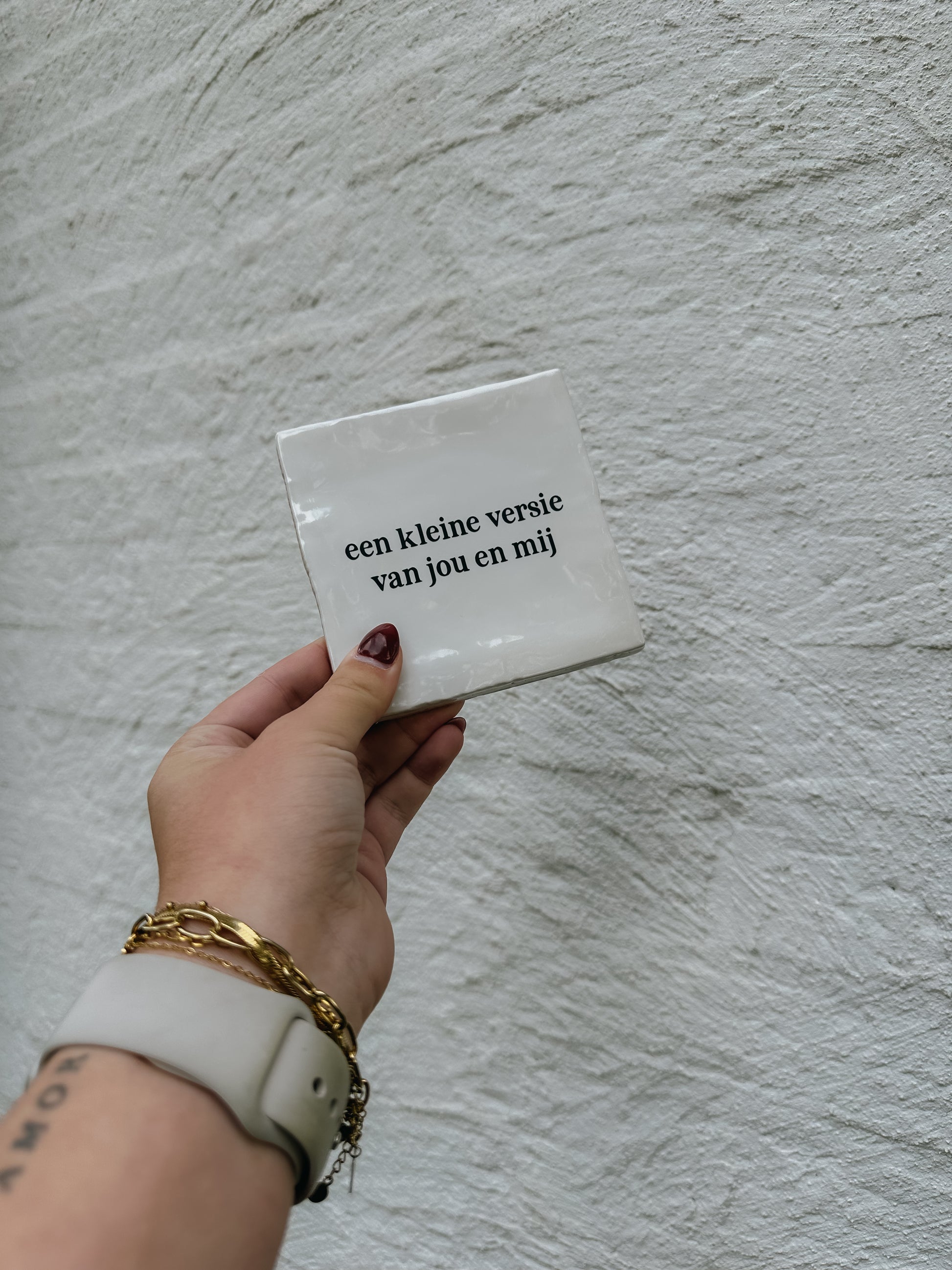 Hoe leuk is deze quote tegel Een kleine versie van jou en mij? De met de hand bedrukte tegeltjes zijn tegenwoordig echt een hype en fantastisch in ieder interieur. Hang hem op aan de muur of zet hem ergens neer in combinatie met een leuke vaas of kandelaar. Is dit geen leuk cadeautje om te geven?