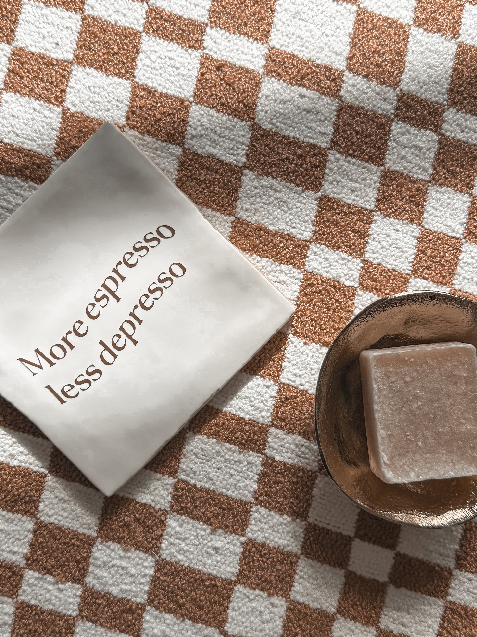 Hoe leuk is deze quote tegel More espresso less depresso? De met de hand bedrukte tegeltjes zijn tegenwoordig echt een hype en fantastisch in ieder interieur. Hang hem op aan de muur of zet hem ergens neer in combinatie met een leuke vaas of kandelaar. Is dit geen leuk cadeautje om te geven?