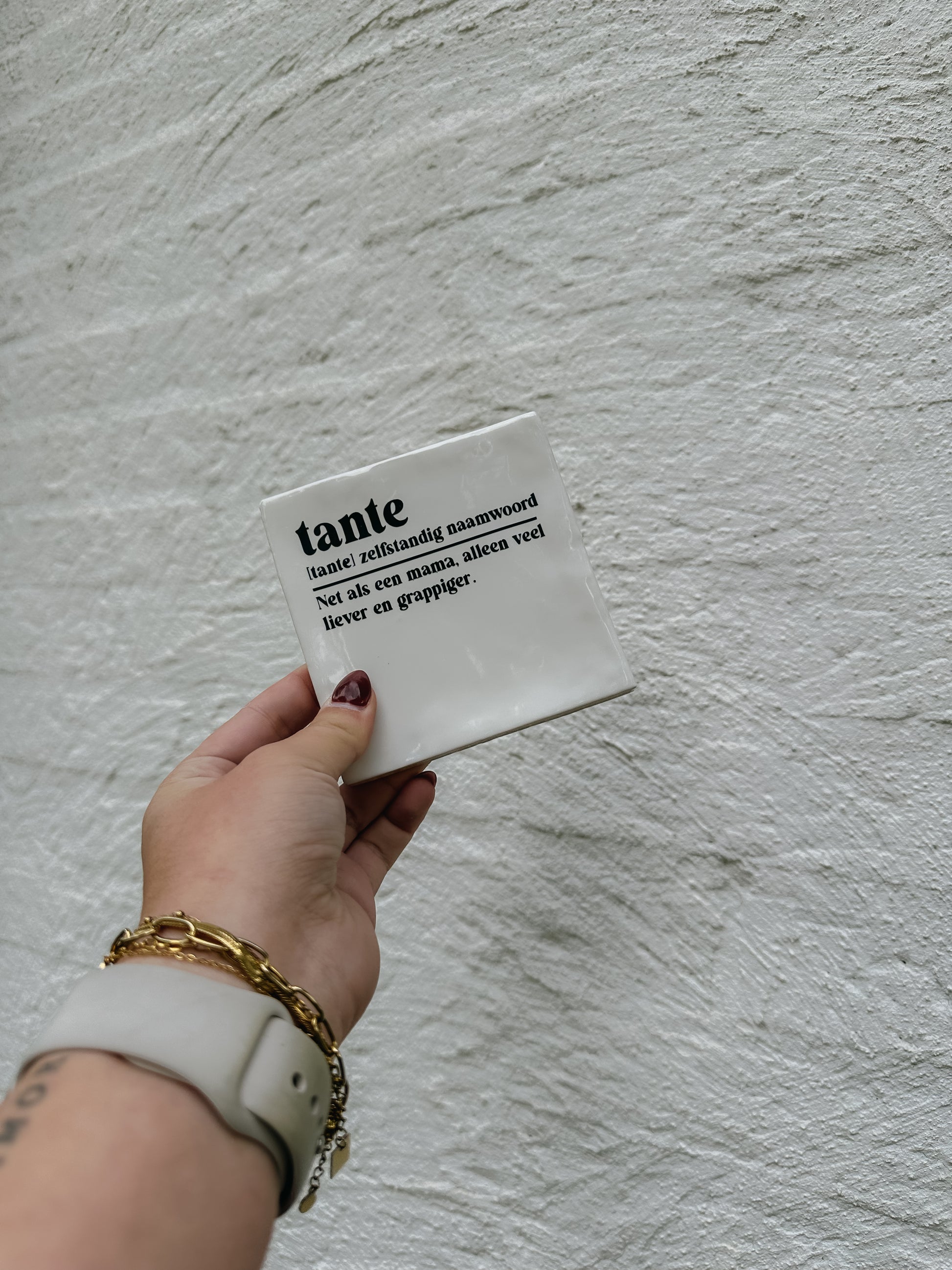 Hoe leuk is deze quote tegel Tante? De met de hand bedrukte tegeltjes zijn tegenwoordig echt een hype en fantastisch in ieder interieur. Hang hem op aan de muur of zet hem ergens neer in combinatie met een leuke vaas of kandelaar. Is dit geen leuk cadeautje om te geven?